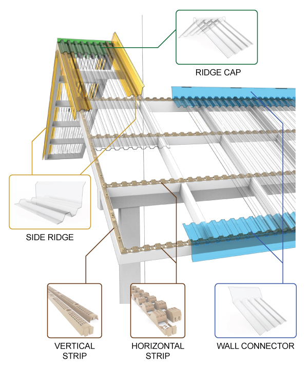 Les plaques en polycarbonate ondulé sont installées comme faisant partie intégrante de la toiture métallique. Pour plus de détails, veuillez consulter les instructions d’installation du profilé souhaité.